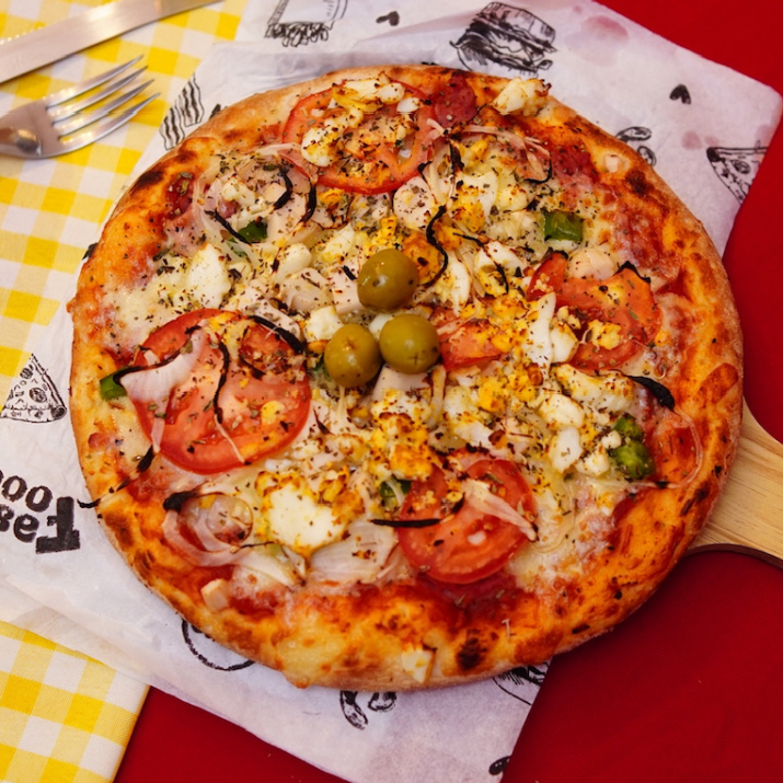 Pizza com Molho de tomate artesanal, queijo mussarela, Presunto ralado, pimentão, ovo cozido, palmito picado, tomate em rodelas, cebola e orégano.