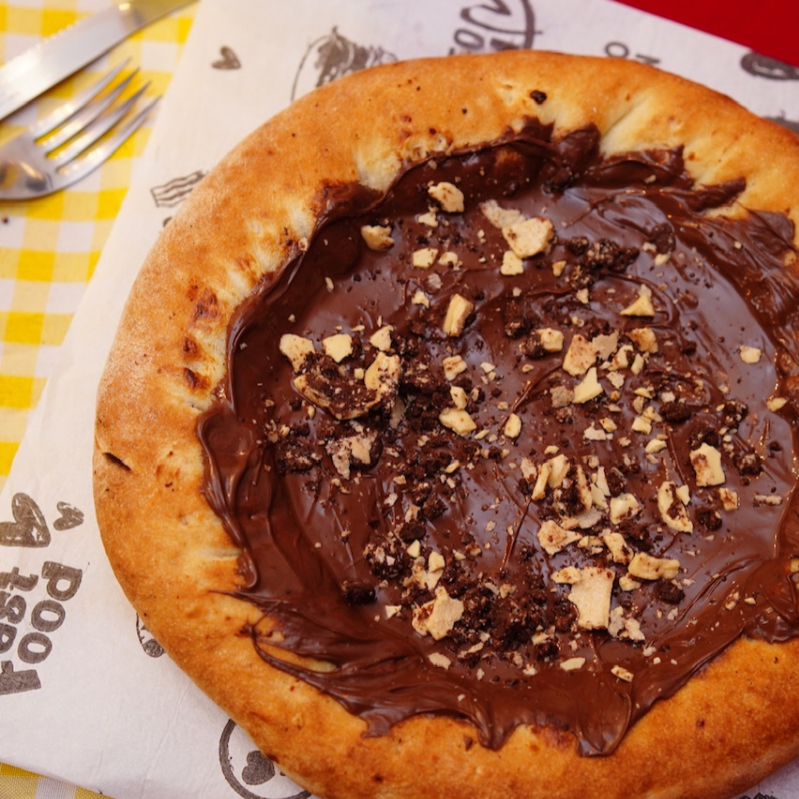 Pizza com A base de creme, Nutella Original, bombons de Valsa triturado.
