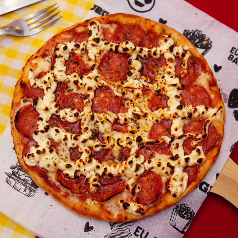 Pizza com Molho de tomate artesanal, queijo mussarela, Peperoni levemente picante, cream cheese Philadelphia cremoso e orégano.