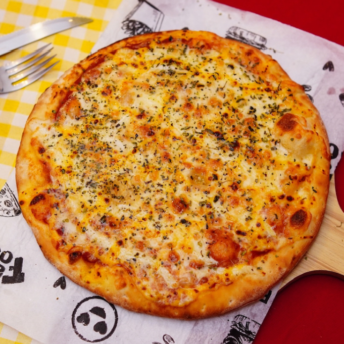 Molho de tomate, queijo mussarela, Catupiry Original, cheddar Original e uma pitada de orégano.