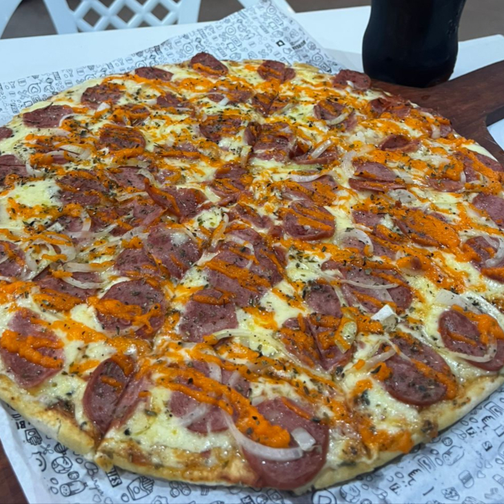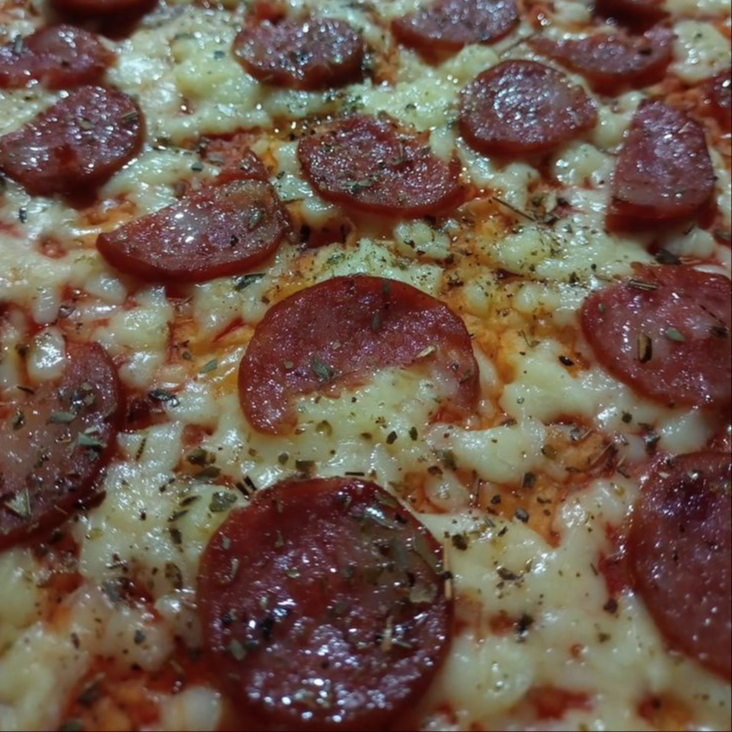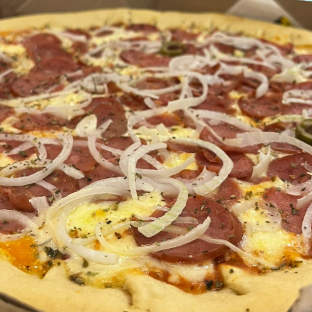 Deliciosa pizza com fatias de calabresa, cebola e orégano.