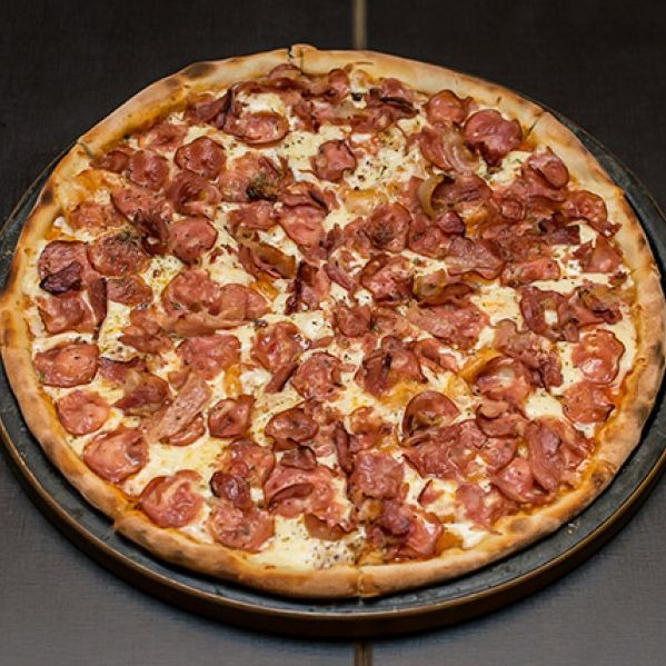 Molho de tomate, mussarela, calabresa, bacon, cebola, orégano.