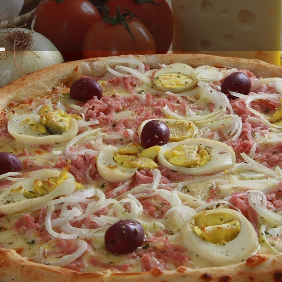 Molho, mussarela, presunto, ovo cozido, azeitona, cebola, tomate, orégano e milho.