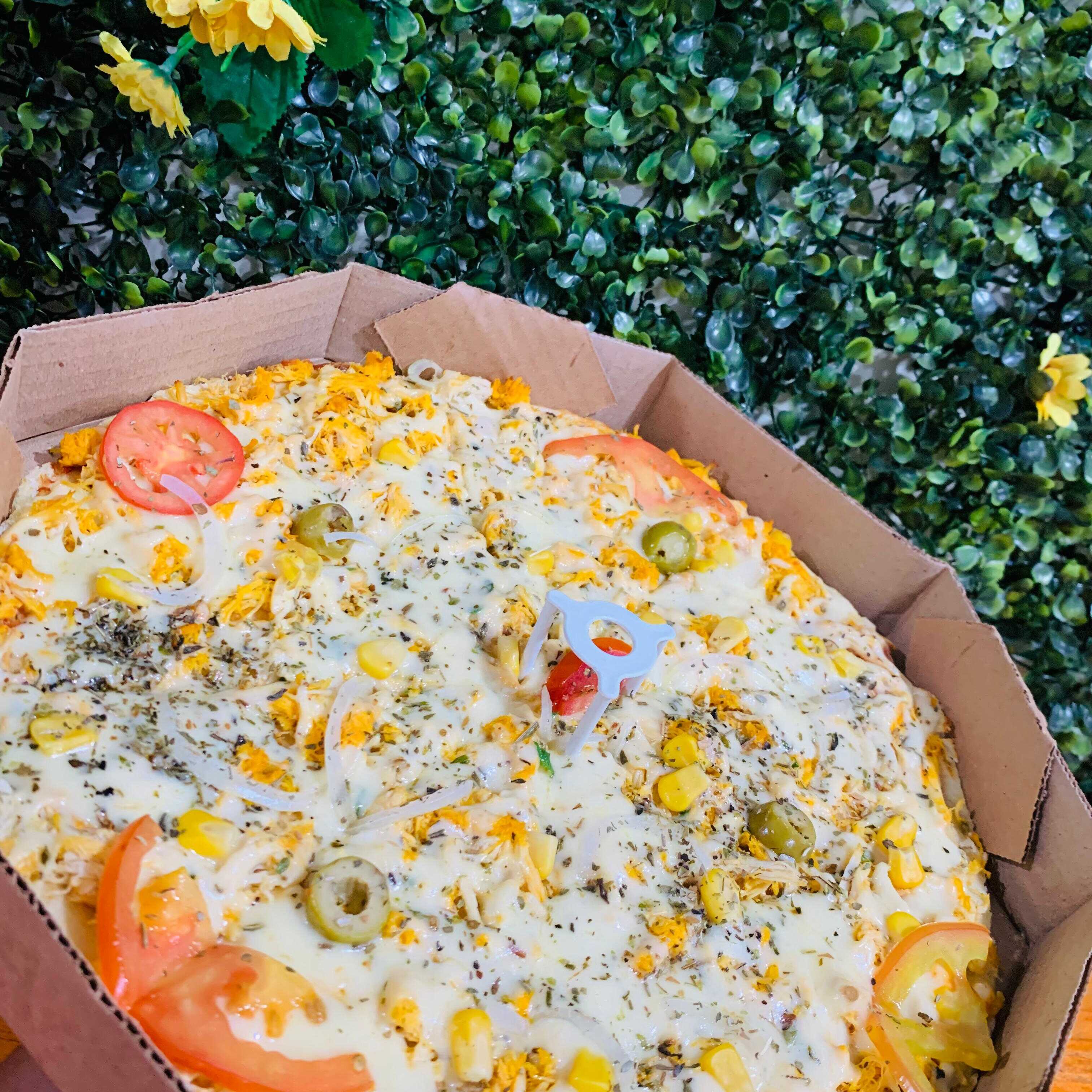 Molho, mussarela, frango desfiado, catupiry, azeitona, cebola, orégano e milho.