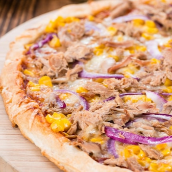 Molho, mussarela, atum, requeijão, azeitona e milho.