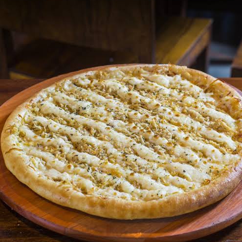 Molho, mussarela, catupiry, cheddar, bacon, cebola e orégano.