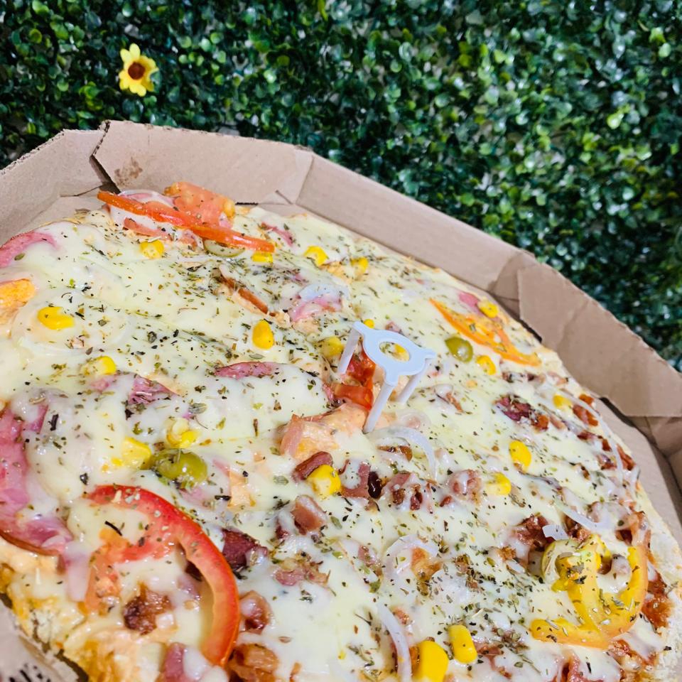 Molho, mussarela, bacon, calabresa, frango, azeitona, cebola, tomate, orégano e milho.