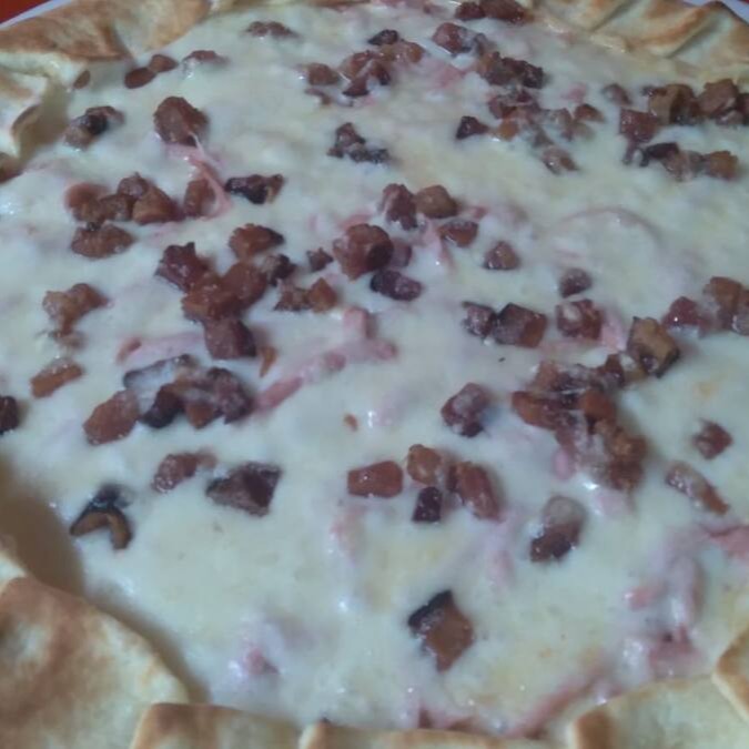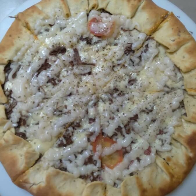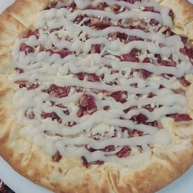 Molho de tomate, Mussarela, carne de sol, bacon, catupiry, Cebola, tomate fatiado