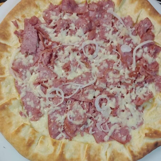 Molho de tomate, Mussarela, calabresa, Catupiry, cebola, tomate fatiado e orégano