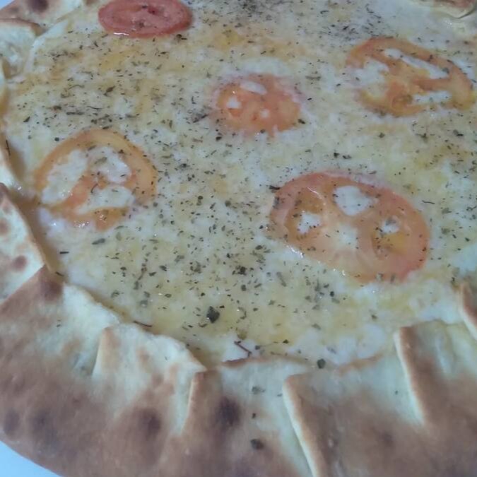 Molho de tomate, Mussarela, tomate picado, alho, queijo parmesão e orégano