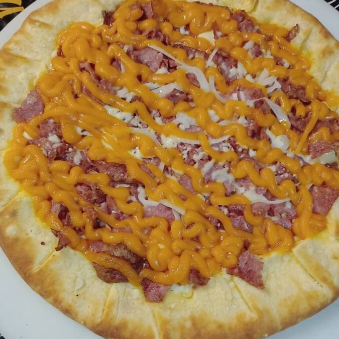 Molho de tomate, Mussarela, presunto, bacon, cebola e orégano