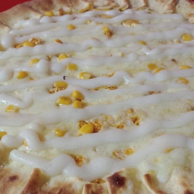 Molho de tomate, Mussarela, frango, milho verde cheddar e orégano