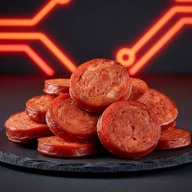 Calabresa fatiada e grelhada, perfeita para dar um toque defumado e marcante ao burger.