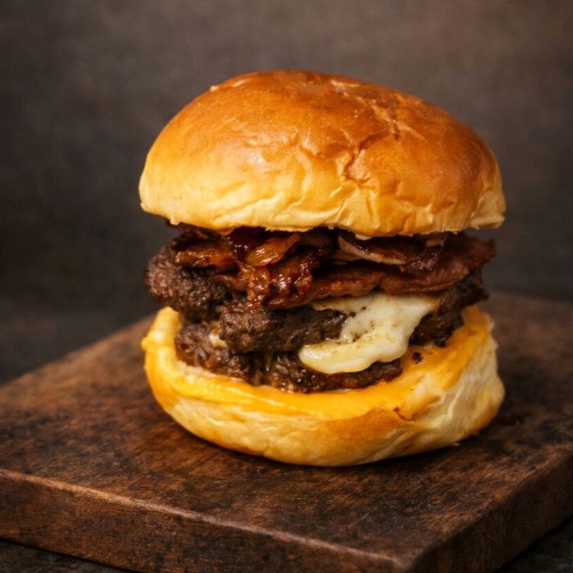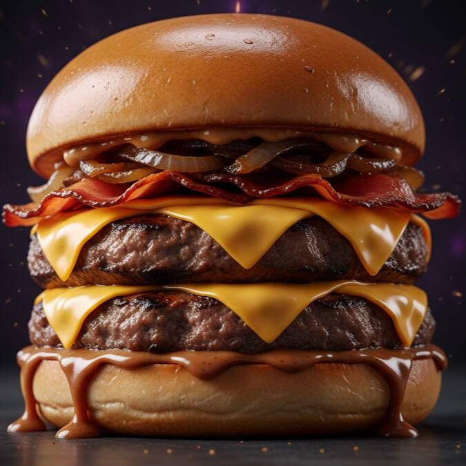 Poder infinito no seu paladar! Pão bola, 2 carnes de 100g, cheddar, bacon, cebola caramelizada e molho especial da casa. O burger supremo para quem quer conquistar a fome máxima e atingir o nível lendário do sabor!