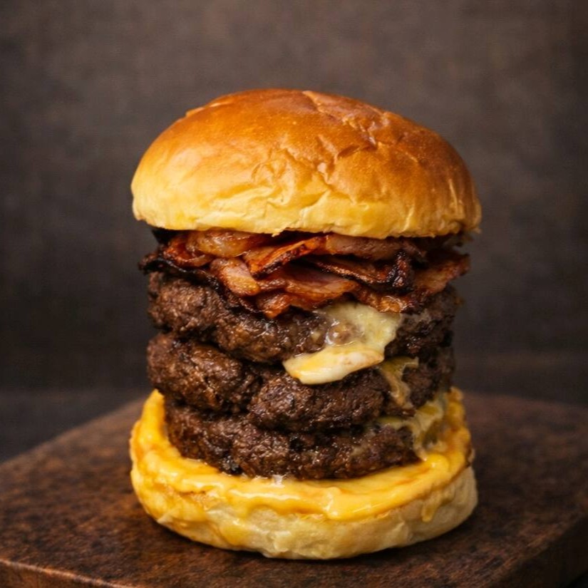 Boss fight à vista! Pão bola, 3 carnes 100g, 2 fatias de cheddar, bacon e molho especial da casa. Para quem não tem medo de desafios e quer vencer a fome!