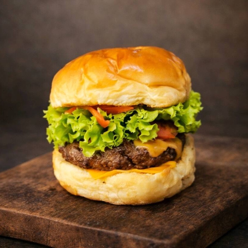 Hambúrguer artesanal de 100g, suculento e grelhado na chapa.