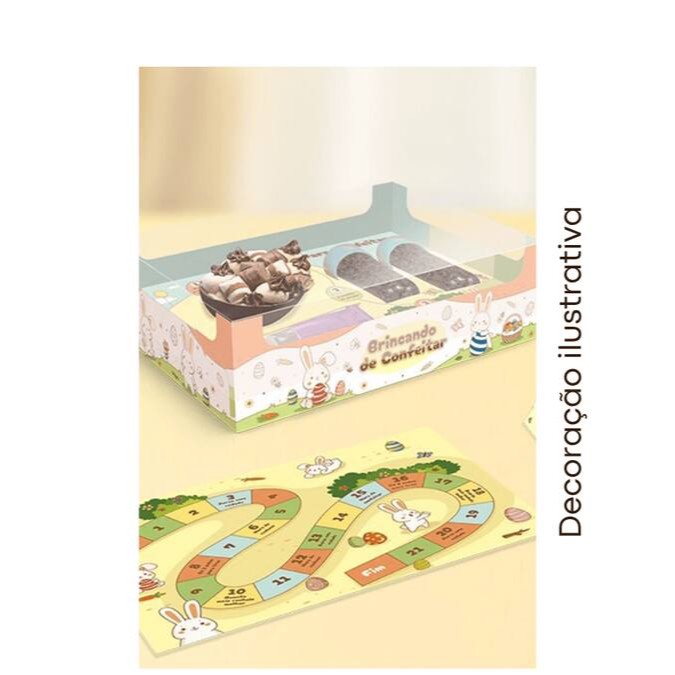 Kit confeiteiro casca de chocolate, recheio de brigadeiro, confetes, brownies e com jogo de tabuleiro, imagens para colorir