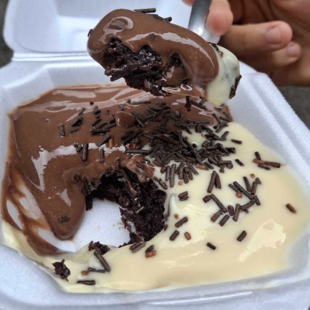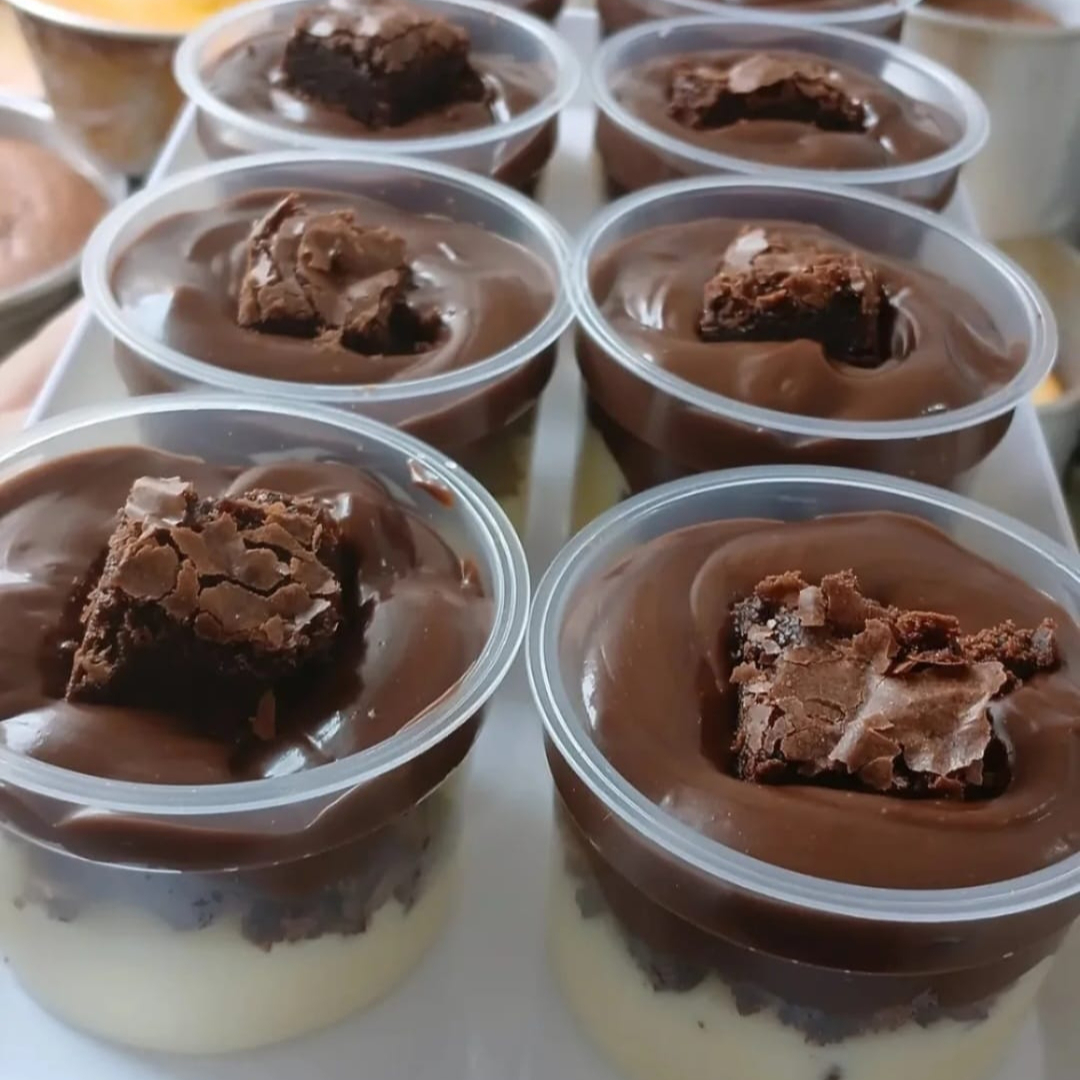 145ml de pura delícia, brownie molhadinho com cremes de chocolate e ninho