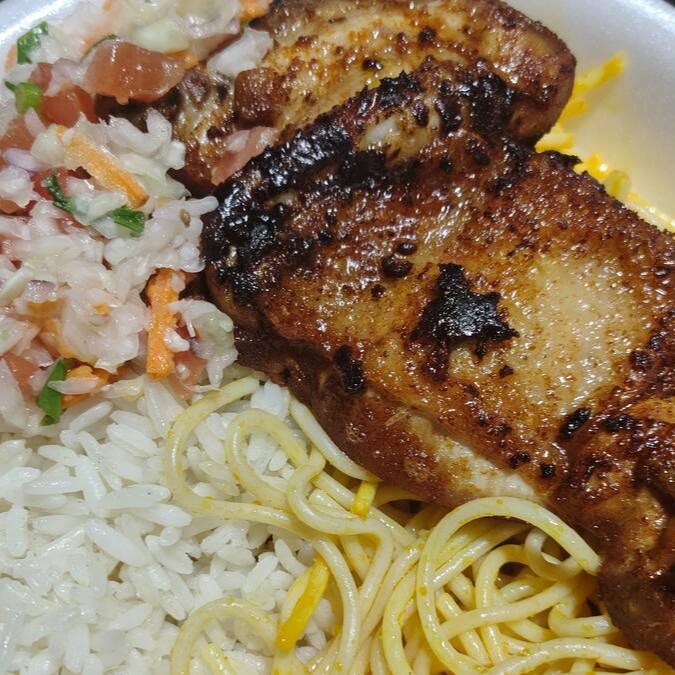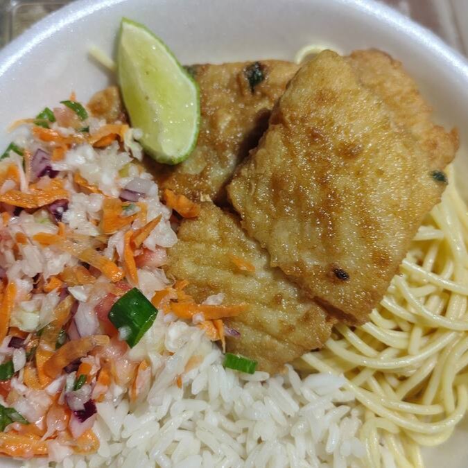 Filé de Peixe Frito, Arroz, Feijão, Macarrão, farofa e salada