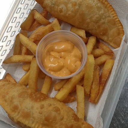 2 Pastéis Em Forma De Meia Lua( Foto Real) Acompanhados De Molho Tártaro Ladeado De Batata Frita Crocante, Escolha O Sabor : Carne Ou Frango.