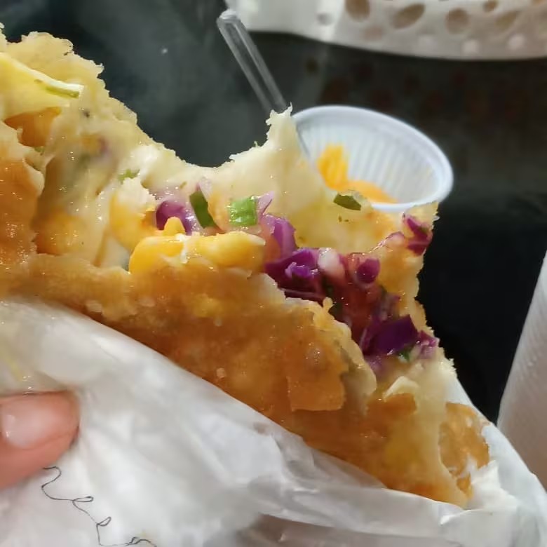Filé de peito de frango desfiado, faça suas combinações com nossos opcionais. Monte seu pastel do seu jeito.