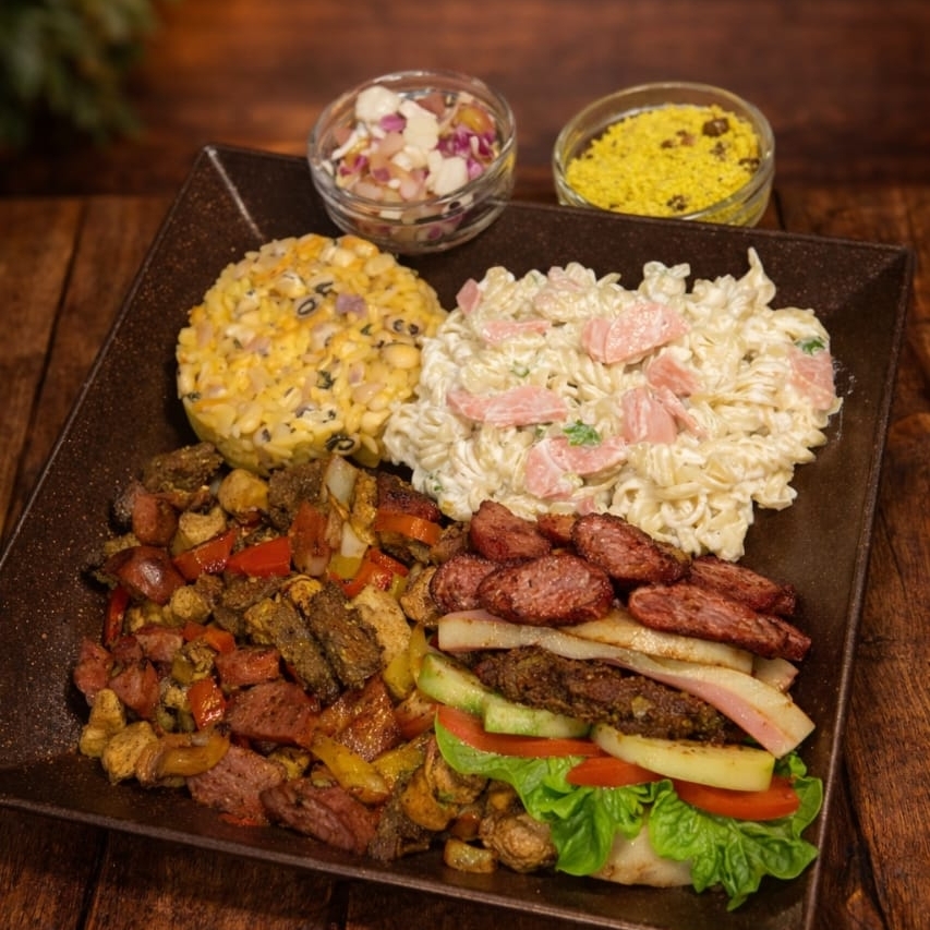 Carne franco calabresa, baião, macarronese, vinagrete e farofa