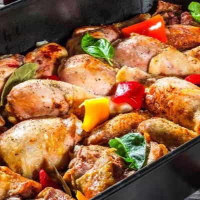Frango assado de forno, Acompanham arroz, macarrão, feijão, salada e farofa e bata frita.