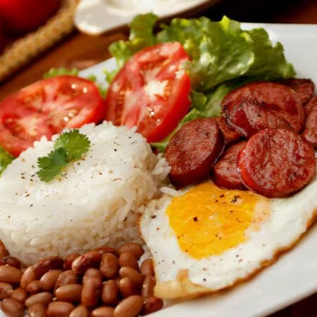 Feijão com ovo frito, calabresa com arroz macarrão e salada e farofa.