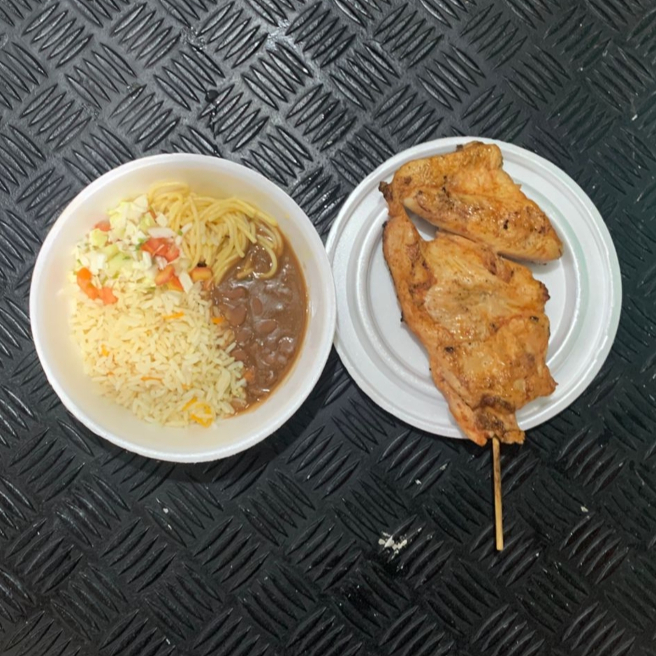 Frango acompanhado de feijão, arroz, macarrão, salada e farofa.