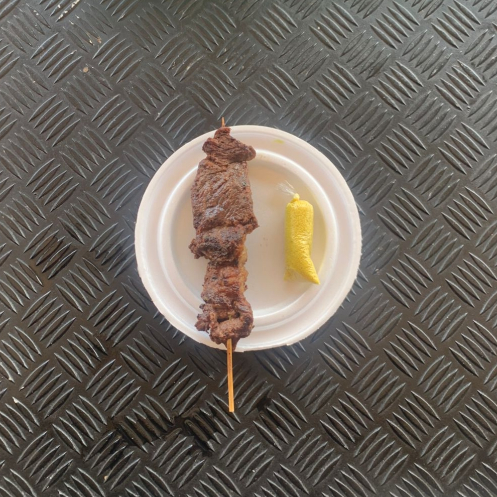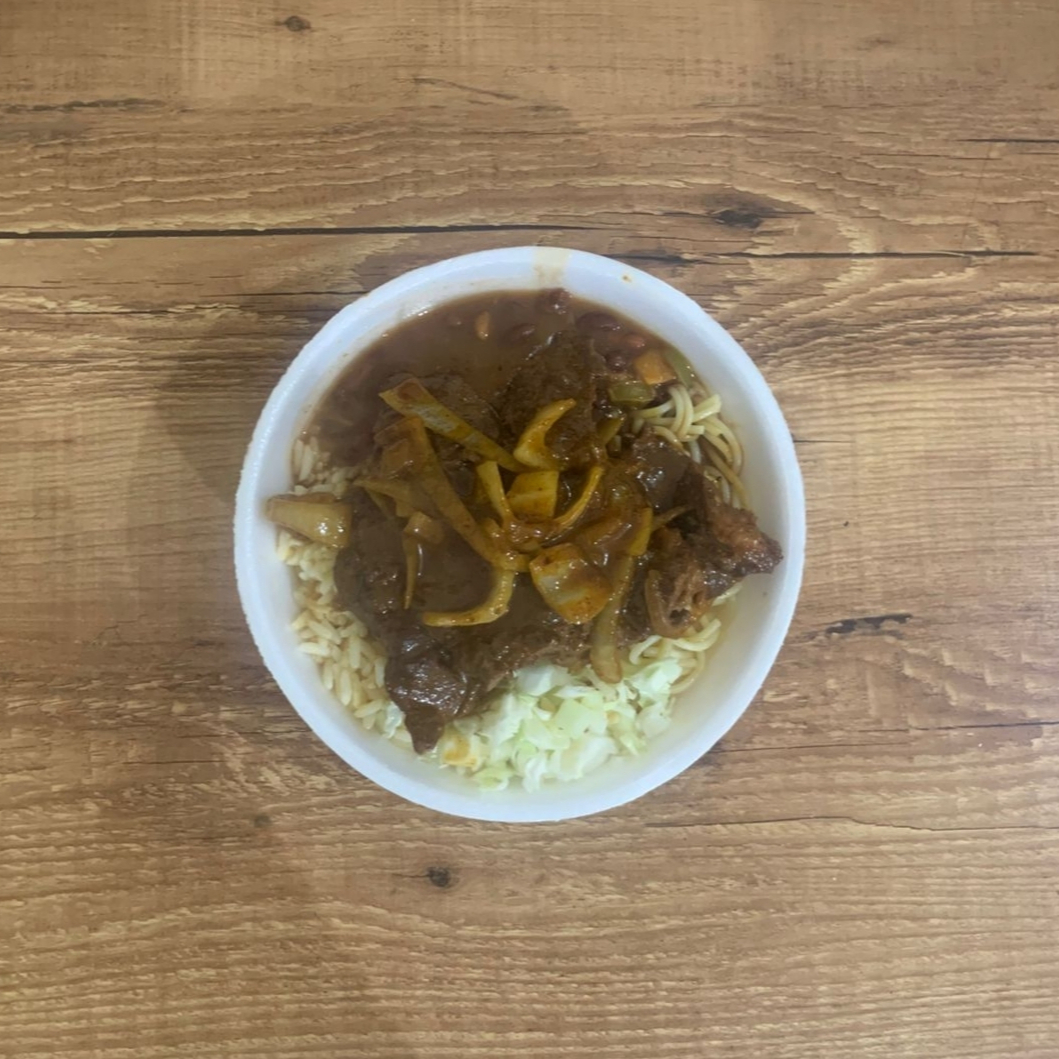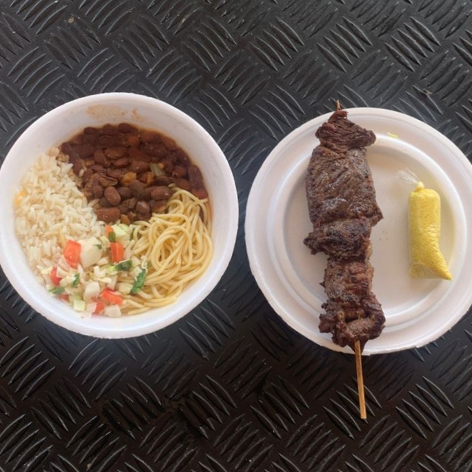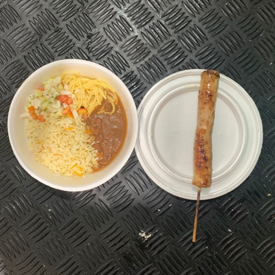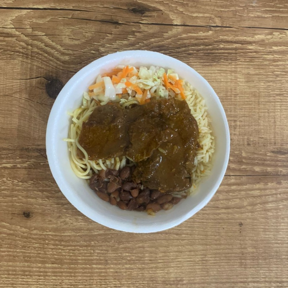 Carne bovina acompanhado de feijão, arroz, macarrão, salada e farofa.