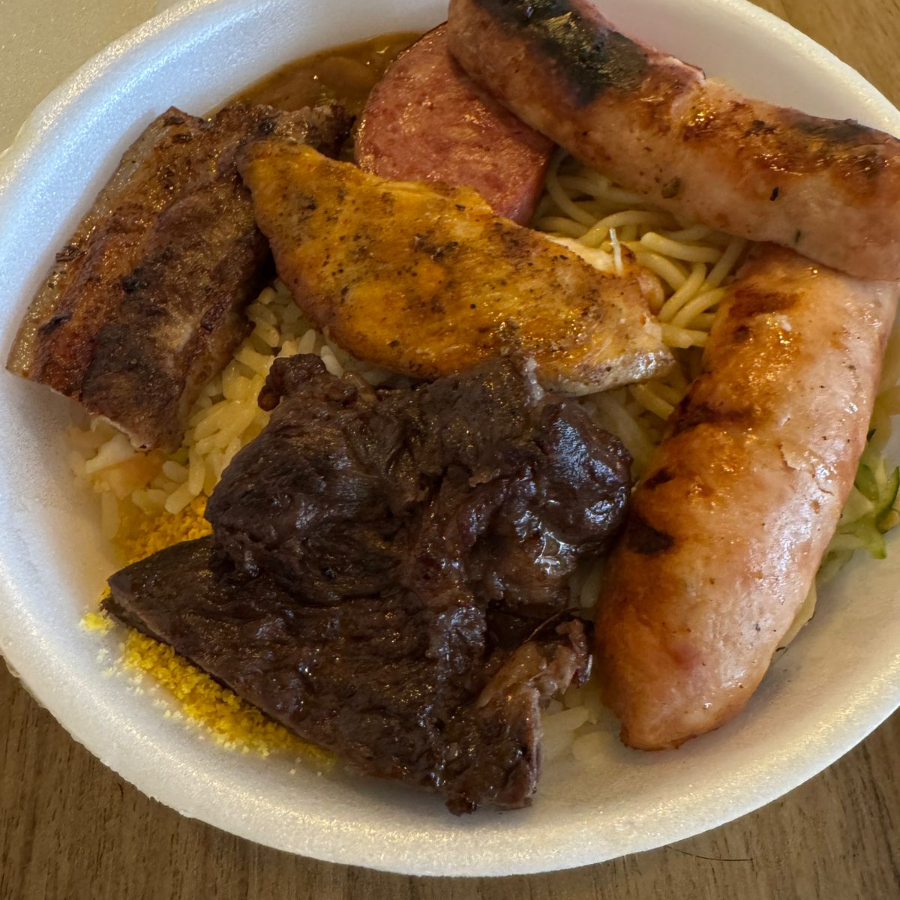 Acompanha feijão, arroz, macarrão, farofa e salada