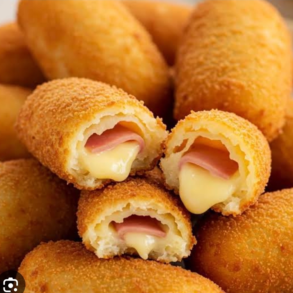Risoles recheado com presunto suculento e queijo derretido, envolto em uma massa crocante.