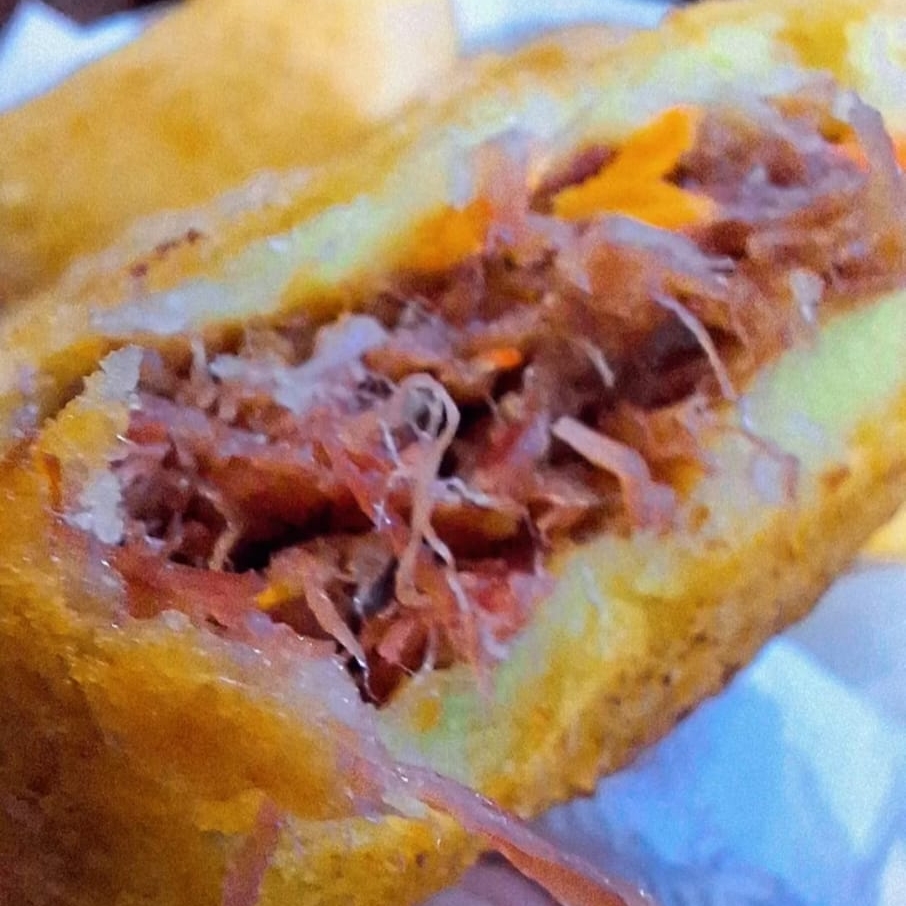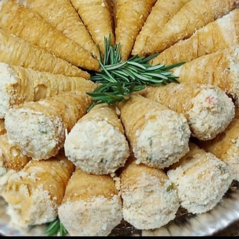 Risoles recheado com carne moída bem temperada e cebolas, frito até ficar dourado.