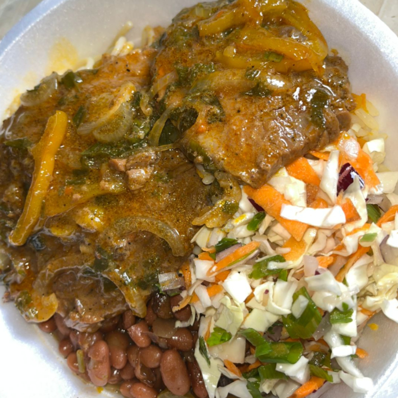 Bife acebolado saboroso servido com arroz, feijão, macarrão , vinagrete e purê.