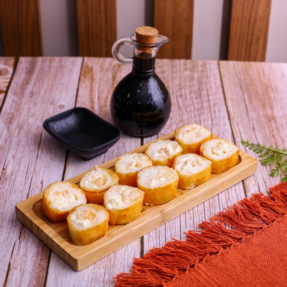 Rolinho de arroz recheado com camarões e cream cheese, envolto em massa de harumaki crocante.