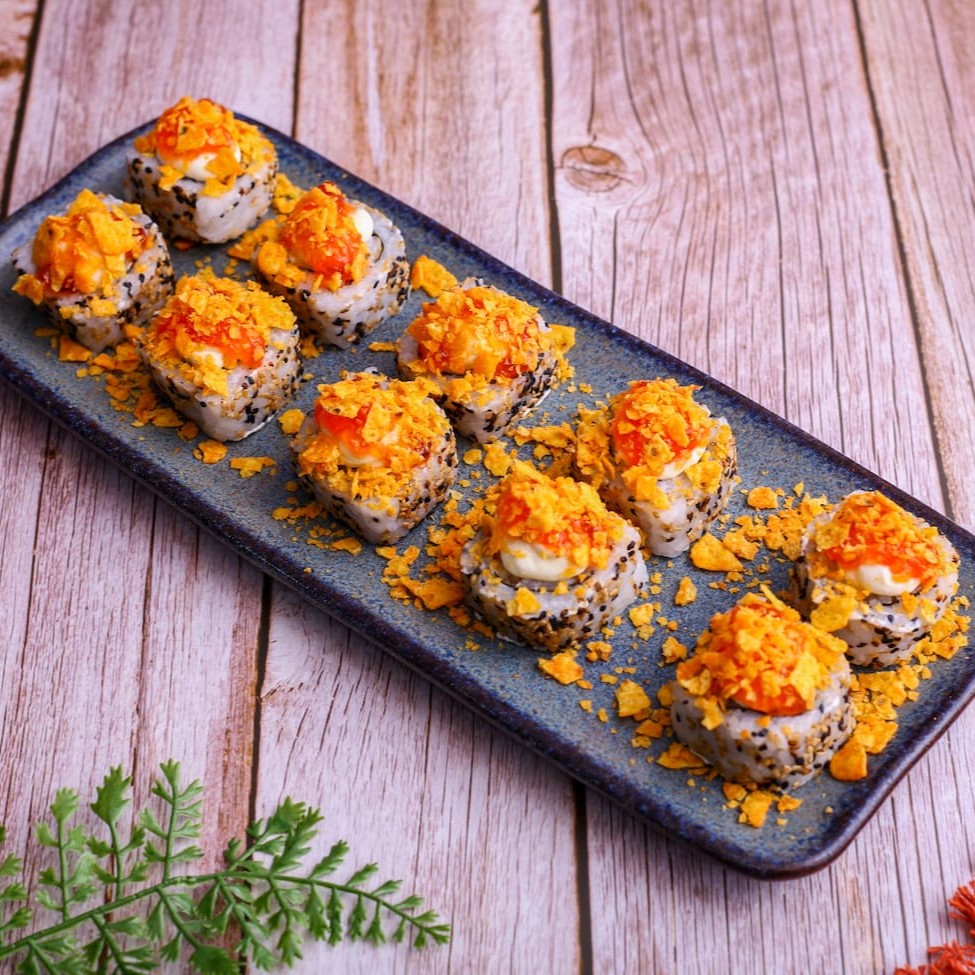 Sushi enrolado com arroz por fora e nori por dentro, recheado com sabor à escolha e finalizado com geleia de pimenta e Doritos.