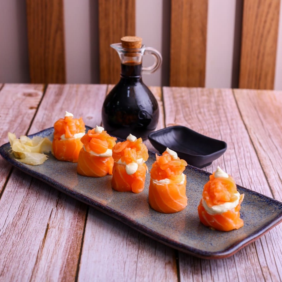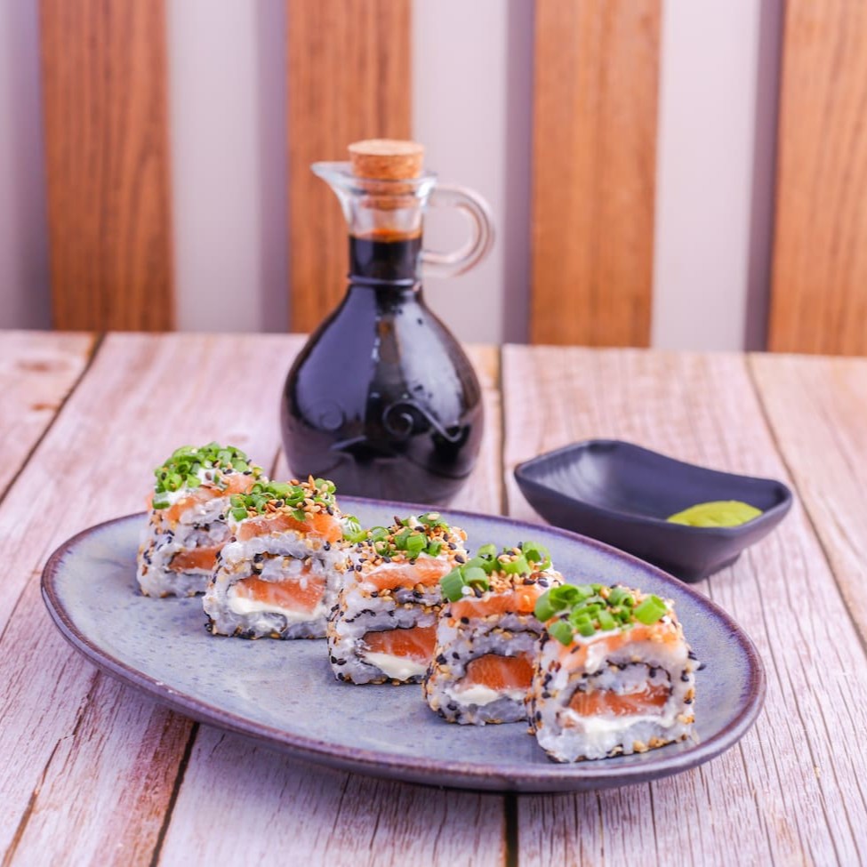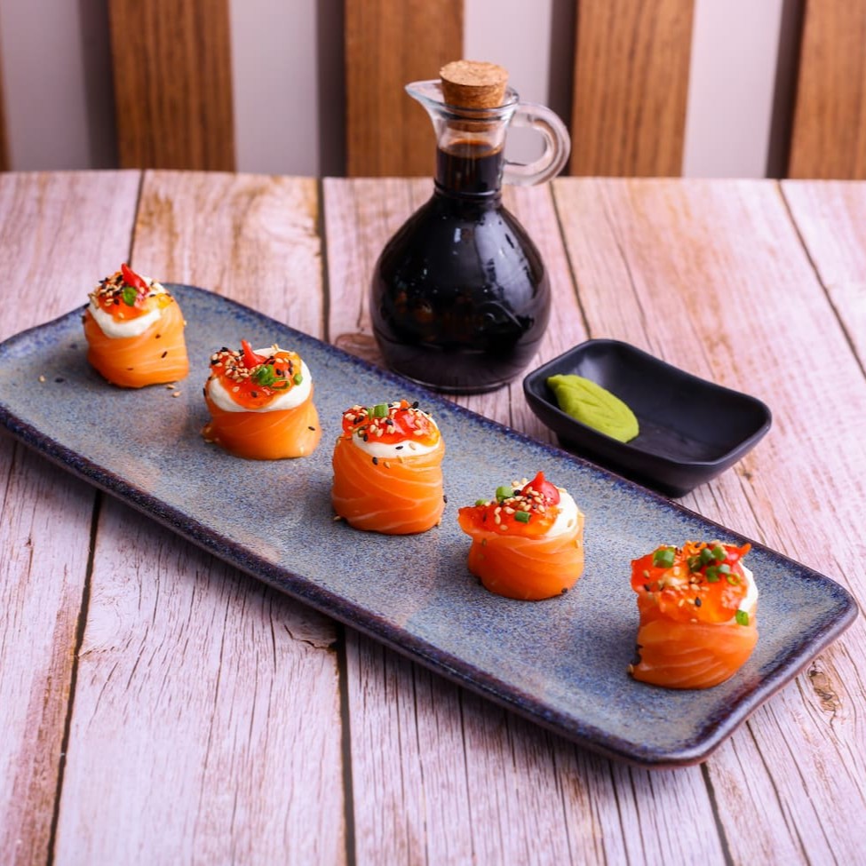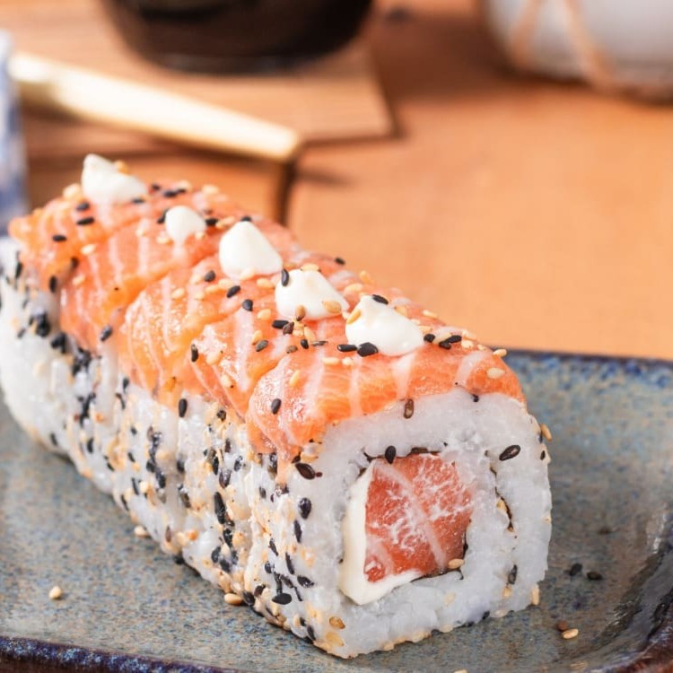 Urasake com dois sabores à escolha, enrolado em arroz temperado, envolto em nori e finalizado com uma lamina de salmão, cebolinha e gergelim