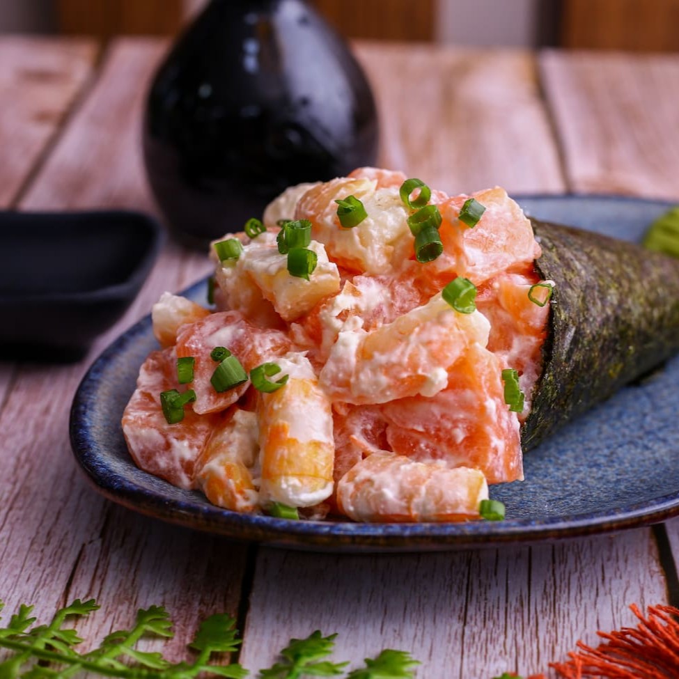 Cone de alga nori recheado com arroz temperado, cream cheese e dois sabores à escolha.