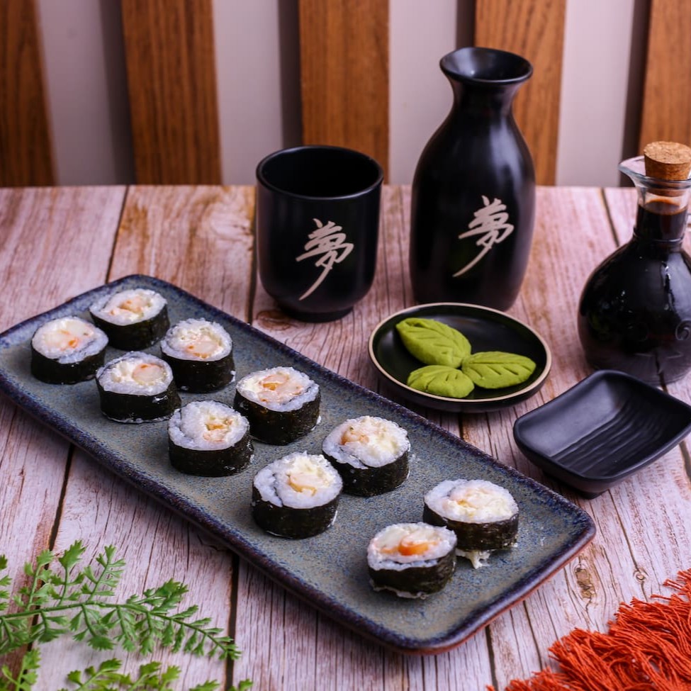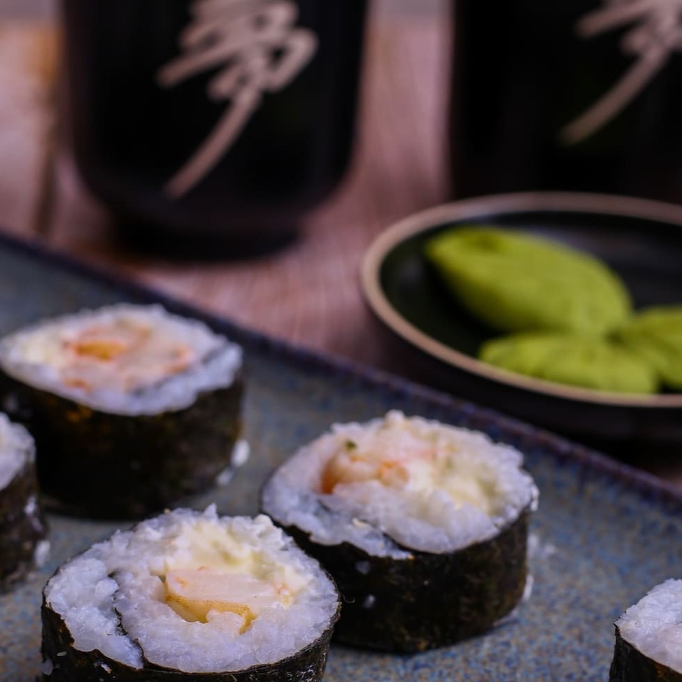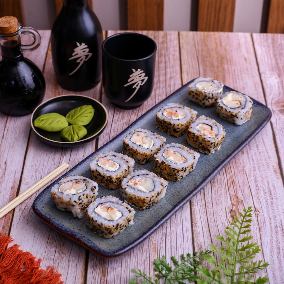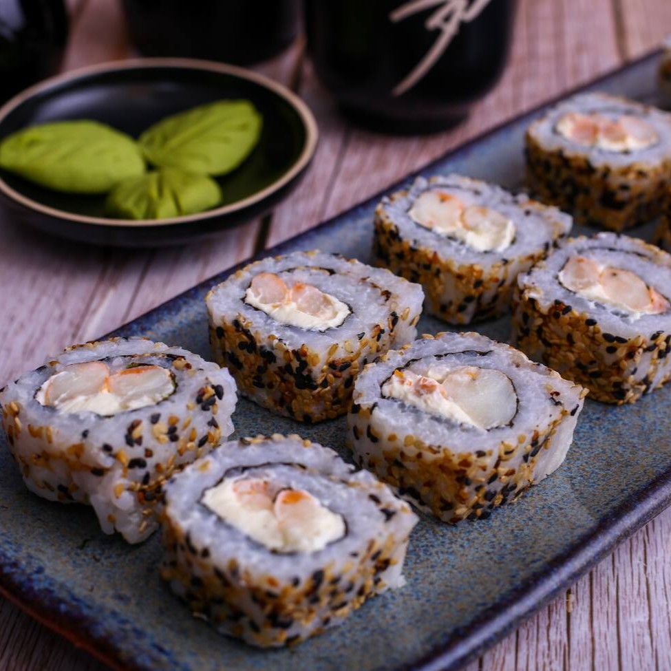 Sushi enrolado com alga nori, recheado com camarão e cream cheese, envolto em arroz temperado.