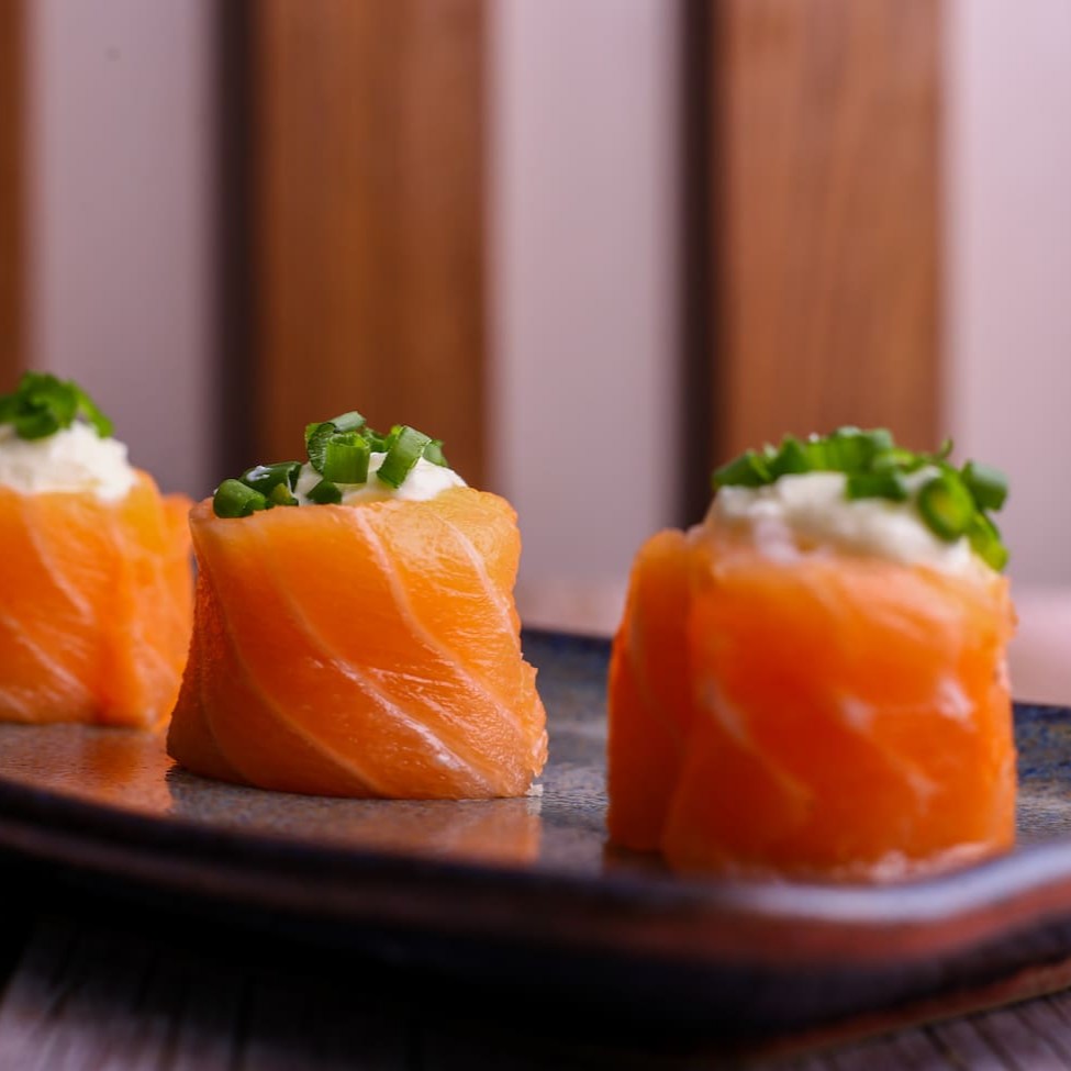 Salmão enrolado em arroz temperado, envolto em nori e finalizado com uma lamina de salmão, cebolinha e gergelim