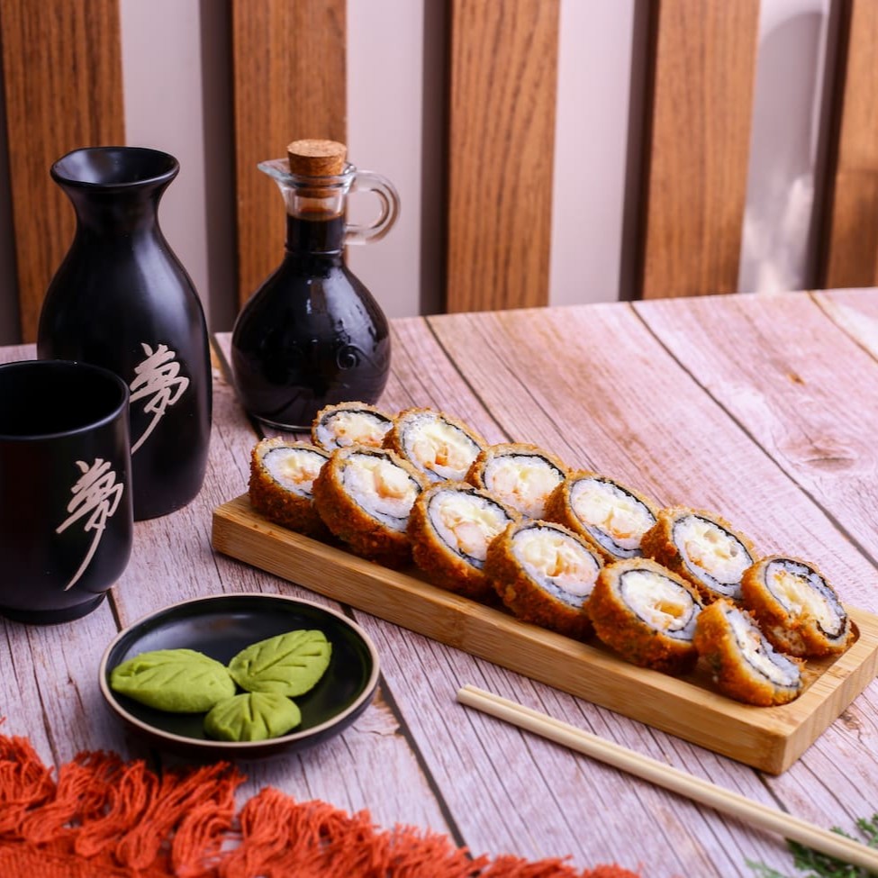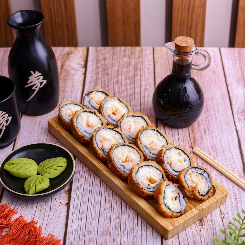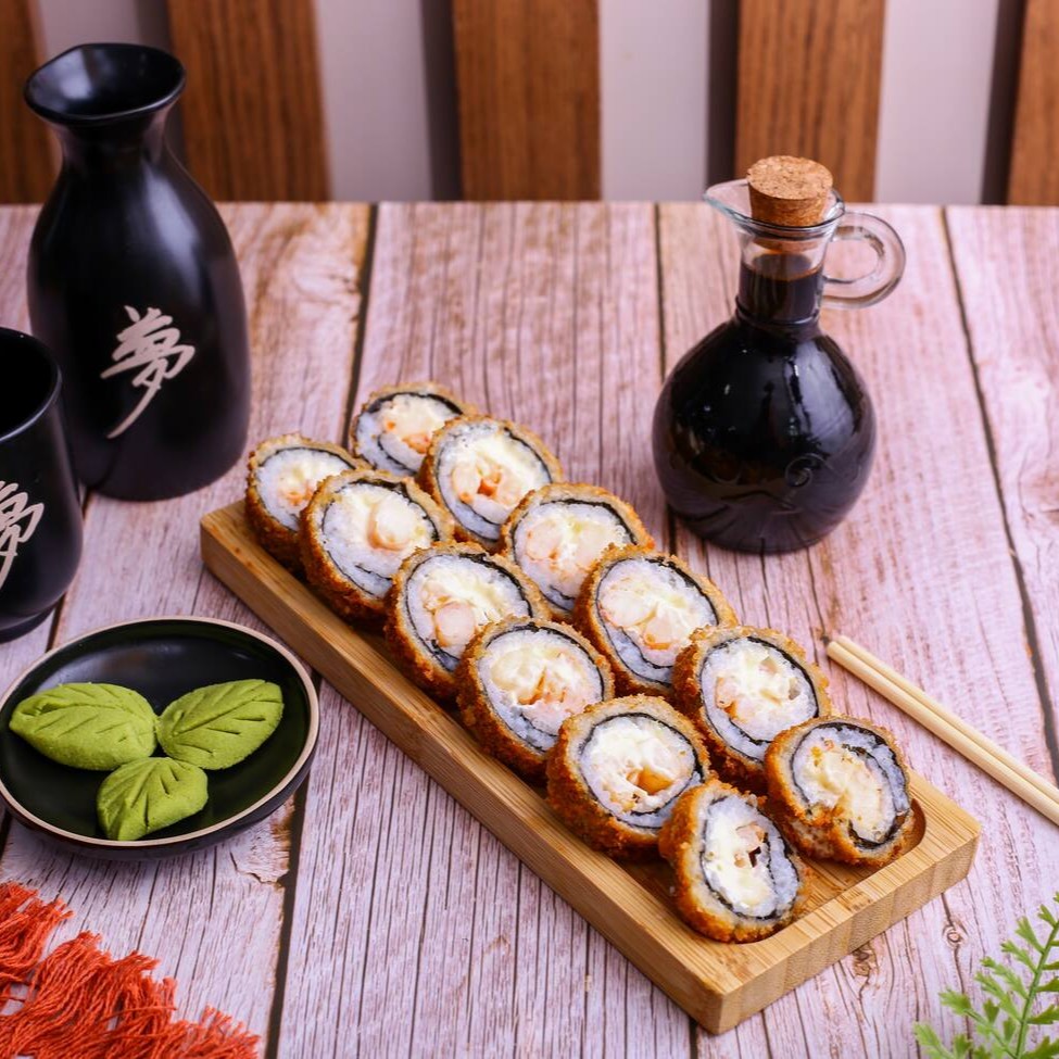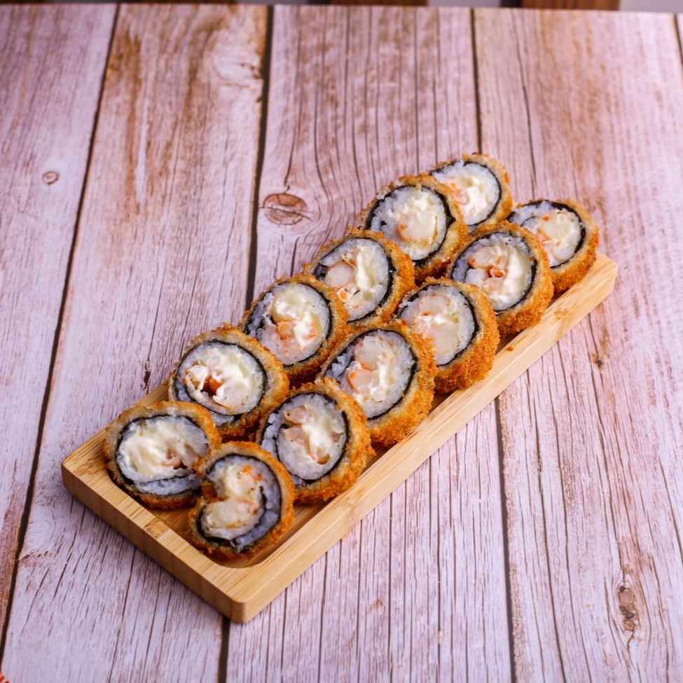 Rolinho empanado e frito, feito com camarões, arroz temperado e alga nori, recheado com cream cheese