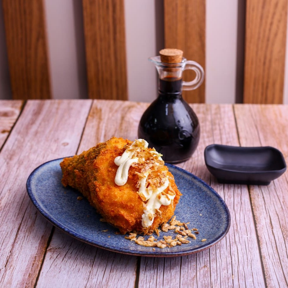 Rolinho empanado e frito, preparado com kani, peppino, manga, arroz temperado e alga nori, e recheado com cream cheese.
