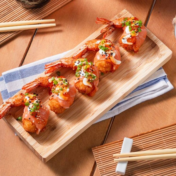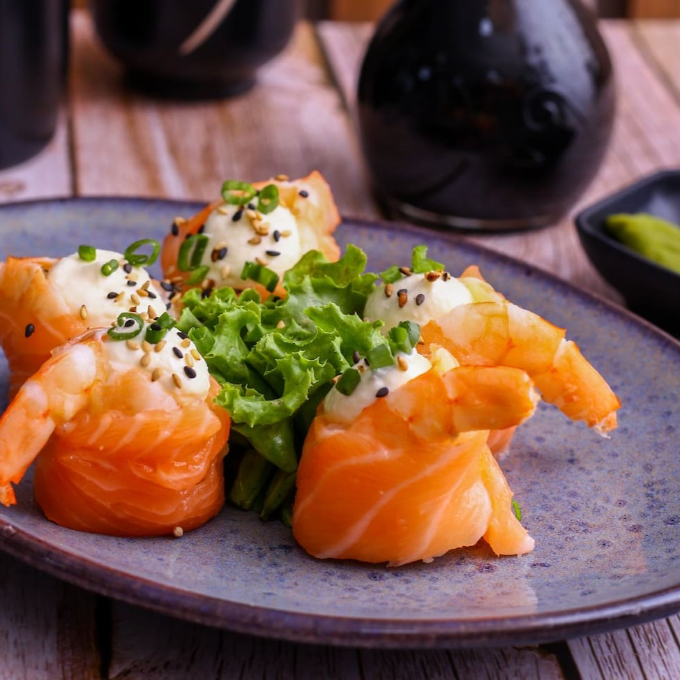 Camarões enrolado em arroz temperado, envolto em nori e finalizado com uma lamina de salmão, cebolinha e gergelim