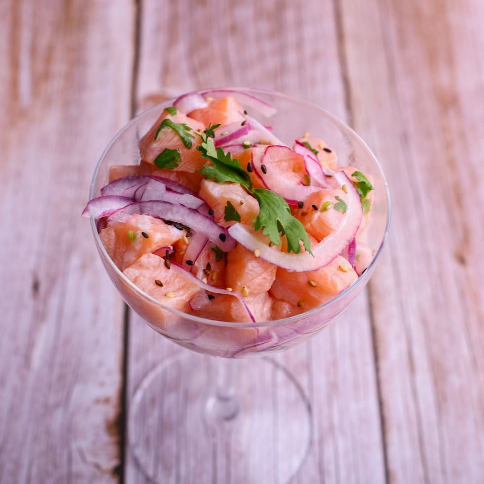 Cubos de salmão marinados no suco de limão e temperos frescos.