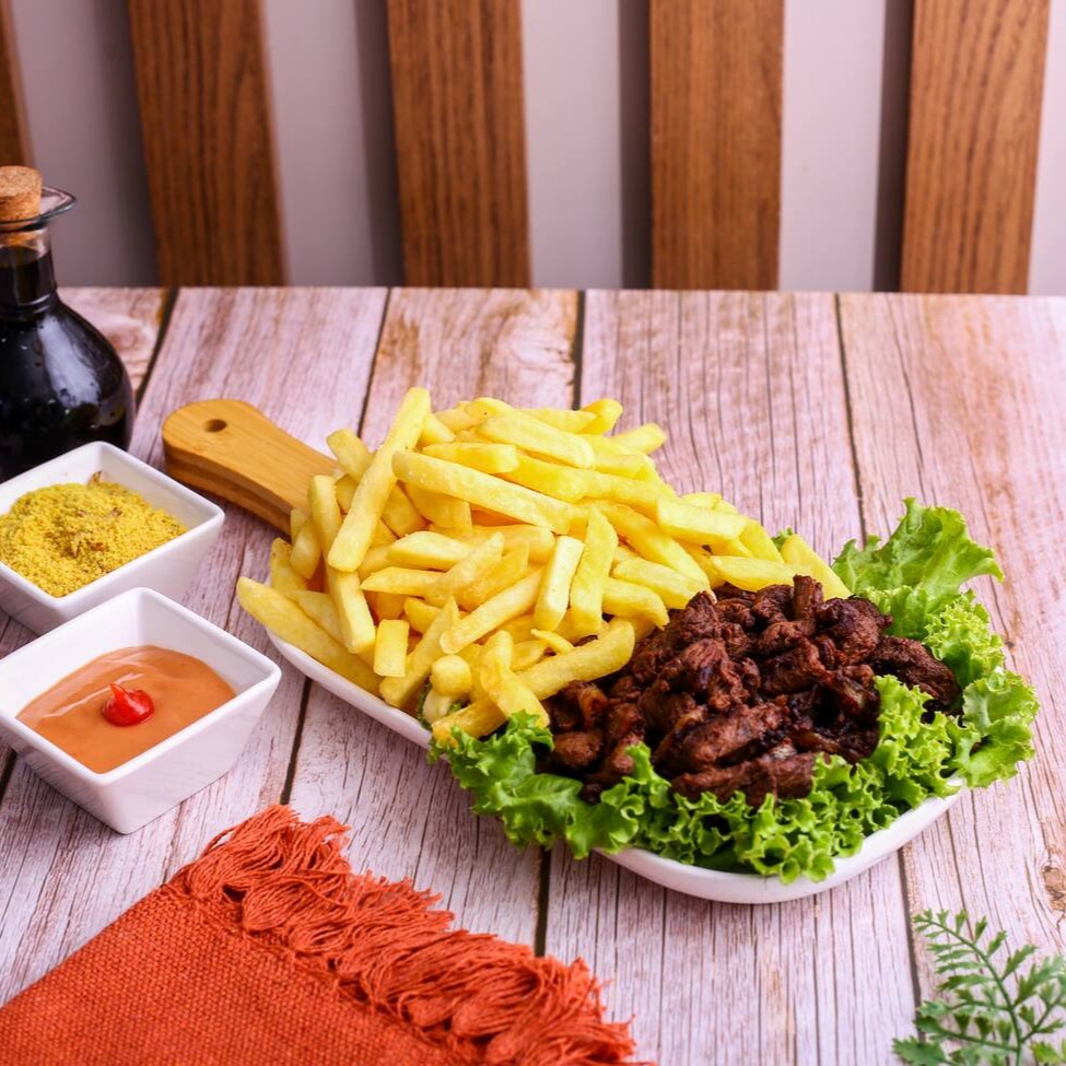 Filé em tiras, acompanhado de batatas, farofa e molho rosé.