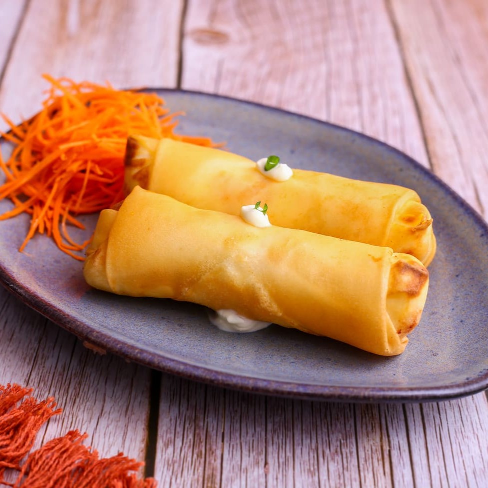 Massa fina de harumaki recheada com dois sabores e cream cheese.