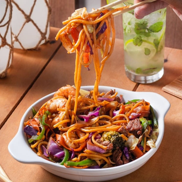 Deliciosa combinação de macarrão ao estilo oriental, legumes frescos, carne e frango.