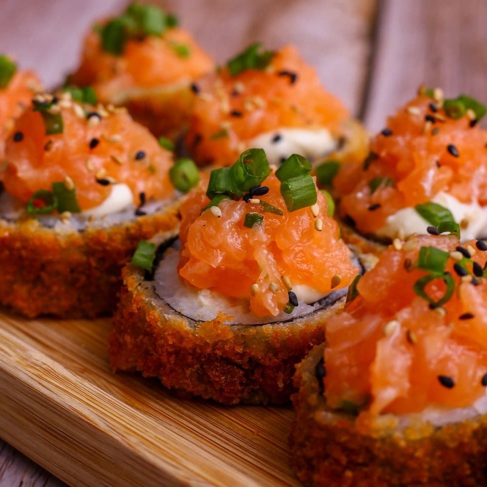 Rolinho de arroz recheado com salmão, envolto em uma massa de harumaki crocante.