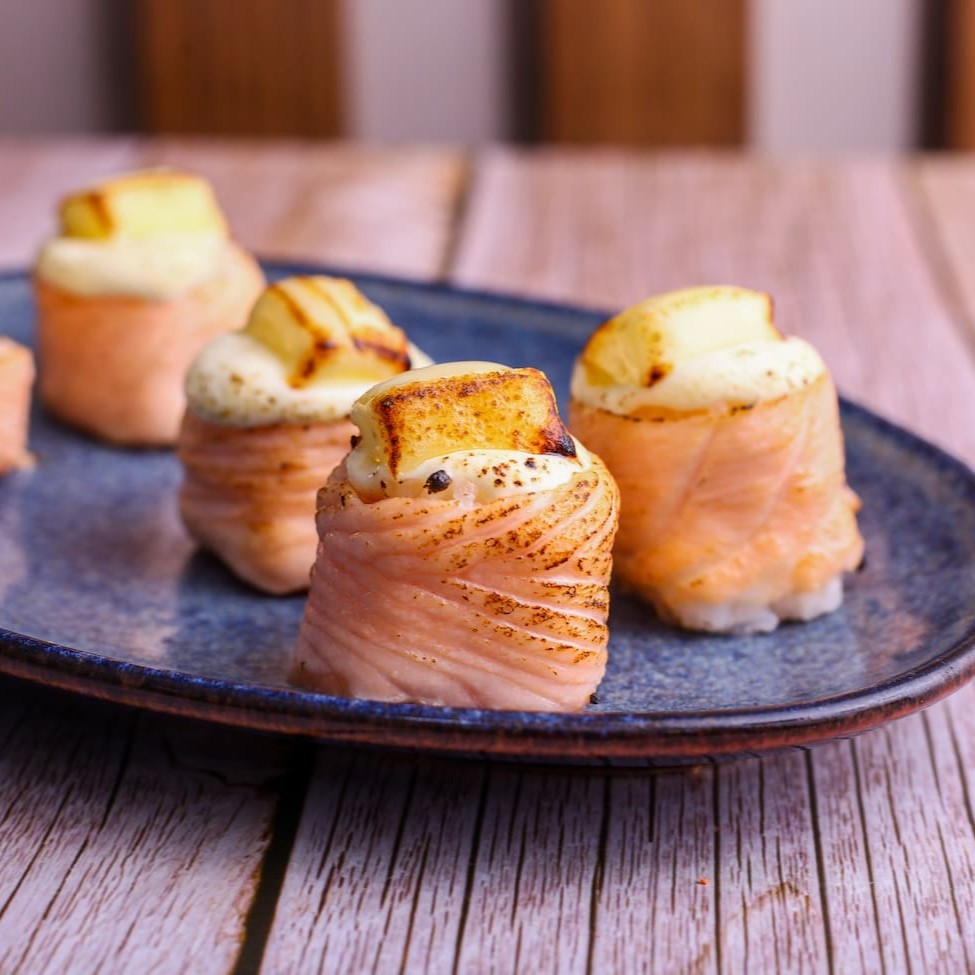Joe de salmão com cobertura de queijo, levemente finalizado com maçarico para um toque defumado.