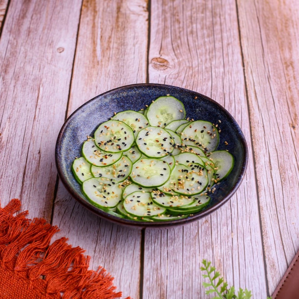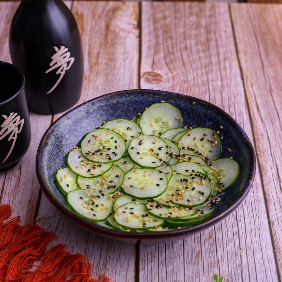 Lâminas de pepino japonês marinadas no vinagre japonês, finalizadas com gergelim.